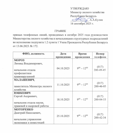 Публикуем график прямых телефонных линий, проводимых в октябре 2025 года руководством Министерства лесного хозяйства и начальниками структурных подразделений во исполнение подпункта 1.2 пункта 1 Указа Президента Республики Беларусь от 13.06.2023 № 172.
